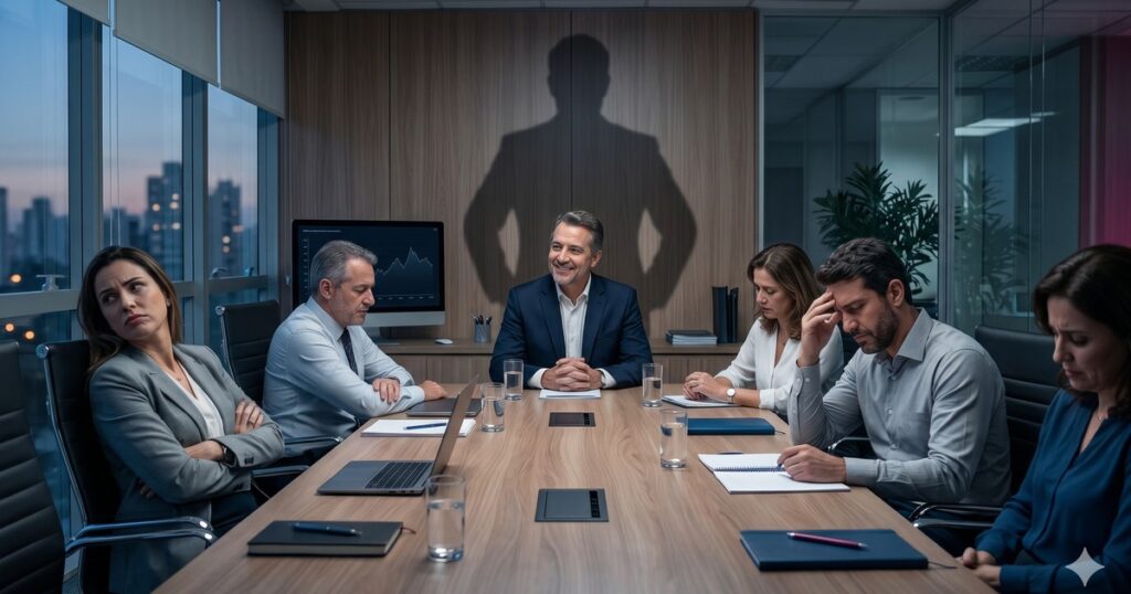Todo o escritório sabe como o narcisista oculto ‘está’ hoje. Quando ele está bem, as pessoas relaxam. Quando está mal, todos pisam em ovos. Esse controle emocional do clima do grupo é uma forma de poder — ele terceiriza sua regulação emocional para os colegas.